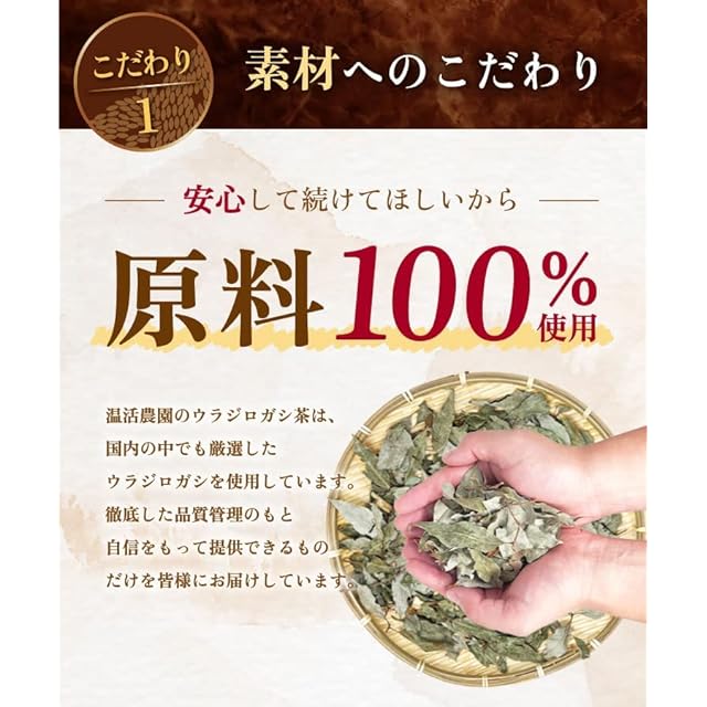 温活農園のウラジロガシ茶は、ウラジロガシ本来の香りが楽しめる健康茶に仕上げるために国内の原材料を100%使用した純国産のお茶です。また衛生管理が徹底された国内の工場で製造された商品をお届けします。使用するティーバッグは≪無漂白のティーバックを使用≫ 材質に漂白工程のない不織布を使用している事で、毎日安心して続けていただけます。