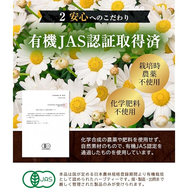 有機JAS認定を受けたカモミールを使用。有機食品のJASに適合した生産が行われていることを登録認証機関が検査し、その結果、認証された事業者のみが有機JASマークを貼ることができます。栽培時農薬不使用、化学肥料不使用です。 こだわりの手法でより香り高く飲みやすいカモミールティーに仕上げました。 カモミールは別名「カミツレ」と呼ばれキク科のハーブの1つです。リンゴのような、ほのかな甘みとやさしい香りををお楽しみください。 「癒やしのハーブ」の代表格とも言われ、リラックスや癒やしの時間にも役立つハーブとしても人気です。夜寝る前のリラックスタイムや、うがいに使用するのもおすすめです。
