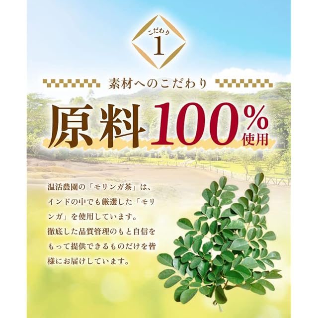 温活農園のインド産 モリンガ茶は、高品質なモリンガを100%使用しています。また衛生管理が徹底された国内の工場で製造された商品をお届けします。また衛生管理が徹底された国内の有機JAS認証工場で製造された商品をお届けします。使用するティーバッグは≪無漂白のティーバッグを使用≫ 材質に漂白工程のない不織布を使用しております。 こだわりの手法でクセがなく飲みやすいお茶に仕上げました。 モリンガは種から花までほぼすべての部分を利用できることから「ミラクルツリー ( 奇跡の木 )」と呼ばれている栄養豊富なスーパーフードです。インドを原産とするワサビノキ科の植物で、現在、注目を集めているモリンガ茶をお楽しみください。