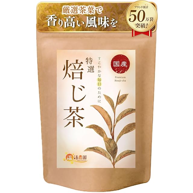 温活農園の特選焙じ茶は、日本国内で栽培から収穫までしっかり品質管理され厳選された国産緑茶を100%使用しています。また衛生管理が徹底された国内の工場で製造された商品をお届けします。また使用するティーバッグは≪無漂白のティーバッグを使用≫ 材質に漂白工程のない不織布を使用している事で、毎日安心して続けていただけます。 こだわりの焙煎方法でやさしく上品な甘い香りに仕上げました。その年の最初に育成した新芽を摘み取って作った「一番茶」の茎と本葉を使用しております。口当たりあっさりで食事のお供にもおすすめです。
