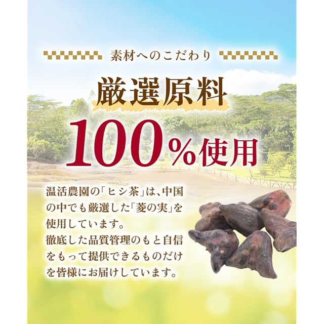 温活農園の中国ヒシ茶です。 メディアで話題のヒシ茶がついに登場!美容が気になる方に大注目のお茶です。 菱の実を厳選して使用し、独自の焙煎技術でおいしいヒシ茶ができました。 すっきりした飲みやすいヒシ茶をぜひお試しください。