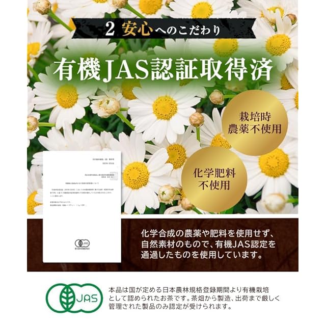 有機JAS認定を受けたカモミールを使用。有機食品のJASに適合した生産が行われていることを登録認証機関が検査し、その結果、認証された事業者のみが有機JASマークを貼ることができます。栽培時農薬不使用、化学肥料不使用です。 こだわりの手法でより香り高く飲みやすいカモミールティーに仕上げました。 カモミールは別名「カミツレ」と呼ばれキク科のハーブの1つです。リンゴのような、ほのかな甘みとやさしい香りををお楽しみください。 「癒やしのハーブ」の代表格とも言われ、リラックスや癒やしの時間にも役立つハーブとしても人気です。夜寝る前のリラックスタイムや、うがいに使用するのもおすすめです。