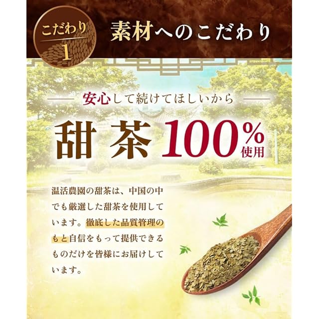 温活農園の甜茶は、高品質な甜茶を100%使用しています。また衛生管理が徹底された国内の有機JAS認証工場で製造された商品をお届けします。使用するティーバッグは≪無漂白のティーバッグを使用≫ 材質に漂白工程のない不織布を使用している事で、毎日安心して続けていただけます。 甜茶は甘いお茶の総称で、原料も栄養もさまざま。優れた栄養成分で近年注目されている甜茶ポリフェノールを含むのは『 バラ科キイチゴ属の甜葉懸鈎子(テンヨウケンコウシ) 』を原料にした甜茶です。温活農園ではそんなバラ科のテンヨウケンコウシを贅沢に100%使用しています。なた豆茶をお求めの方にも人気のお茶です。 何度も試飲を重ねて実現した弊社独自のこだわりドラム式焙煎。自然な甘みを感じられる飲みやすい甜茶ができました。