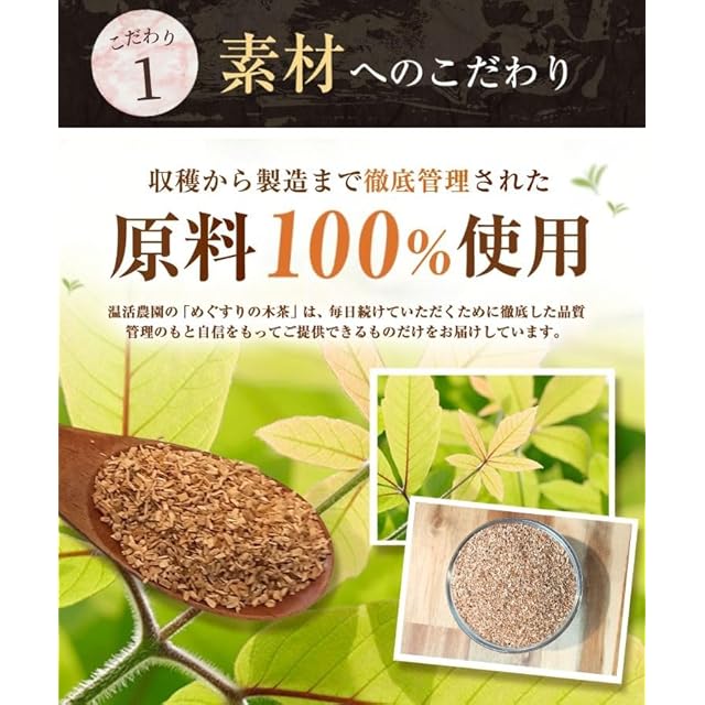 こだわりの手法でクセがなく体に優しいお茶に仕上げました。 ほっとひと息つく自分時間に木の香りとほのかな甘さをお楽しみください。 読書やパソコン・スマートフォン・タブレットをよく使う方におすすめです。 温活農園のめぐすりの木茶は、日本国内で栽培から収穫までしっかり品質管理され厳選された国産のめぐすりの木を100%使用しています。また衛生管理が徹底された国内の工場で製造された商品をお届けします。また使用するティーバッグは≪無漂白のティーバッグを使用≫ 材質に漂白工程のない不織布を使用している事で、毎日安心して続けていただけます。
