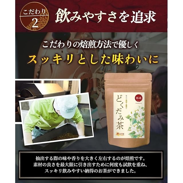 温活農園のどくだみ茶は、日本国内で栽培から収穫までしっかり品質管理され厳選された国産原料を100%使用しています。また衛生管理が徹底された国内の工場で製造された商品をお届けします。使用するティーバッグは≪無漂白のティーバッグを使用≫ 材質に漂白工程のない不織布を使用している事で、毎日安心して続けていただけます。 こだわりの焙煎方法で優しくスッキリとした味わいに仕上げました。ティーバッグなので粉末 パウダータイプの粉っぽさが苦手という方にもおすすめです。