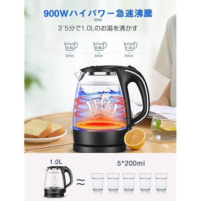 商品名:《新品未開封》【二重構造・火傷防止】HAGOOGI 電気ケトル ガラス ケトル 透明 大容量 1L 耐熱ガラス 触れても熱くない 湯沸かしケトル 急速沸騰 LEDライト付き 電気ポット 一人暮らし コンパクト 湯沸かし おしゃれ 無臭無害 お手入れ簡単 空焚き防止 沸いたら自動でオフ コーヒー 紅茶 お茶 (ブラック)