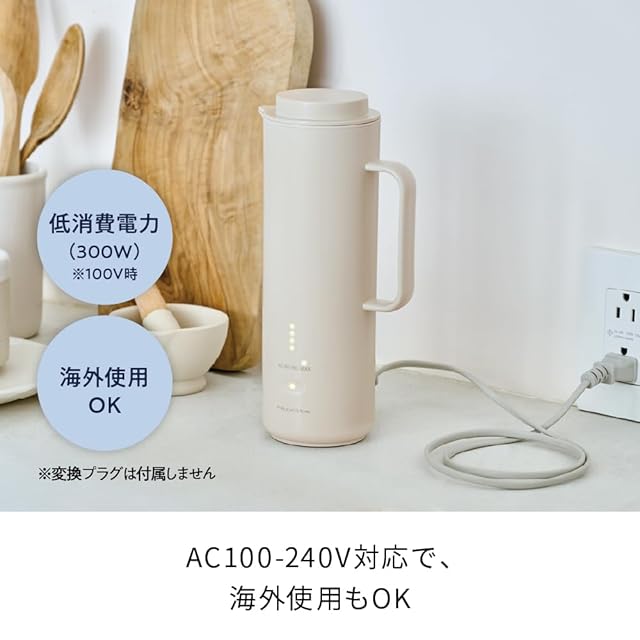 スリム&軽量でスマートに持ち運べる、タンブラー型の温調電気ケトル。 デスクやベッドサイドに置いて“自分専用のもう1台”として使えるほか、持ち運びやすいのでオフィスや旅行にも最適です。 AC100-240V対応で、海外でもお使いいただけます。 ◆ 必要な温度に合わせて沸かせる4段階設定 日本茶・コーヒー・紅茶など、飲み物に合わせてお湯の温度を選べる4段階(60℃・80℃・90℃・MAX)。 ボタンひとつで操作でき、再加熱もスピーディー。MAX温度まで約3分50秒でお湯を沸かせます。 ◆ コンパクトなのに安心設計 倒れてもこぼれにくい構造で、蒸気が吹き出しにくい安心設計。 シンプルかつ機能的なデザインで、毎日のリラックスタイムにぴったりの電気ケトルです。 ◆ 1人用にちょうどいい容量330ml 容量は一人分に最適な330ml。コーヒーや紅茶を飲みたいときにサッと使えて、忙しい朝や在宅ワーク、出張や旅行先でも活躍します。 ◆ 上質感のある3色展開 カラーはホワイト・グレー・ピンクの3色。表面はシボ加工が施されたマット仕上げで、インテリアに馴染むおしゃれなデザインです。