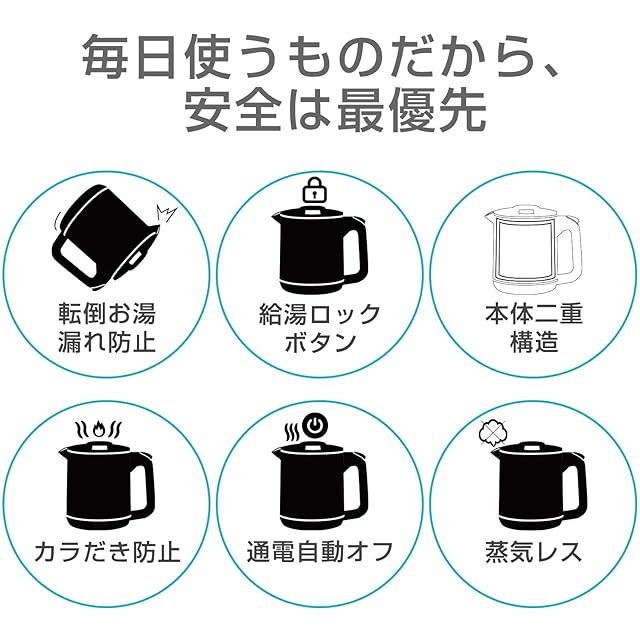 沸とう時間:(約)カップ1杯(140mL)45秒※水温・室温23度、満水(0.8L)4分 / 湯わかし時の消費電力1300W
