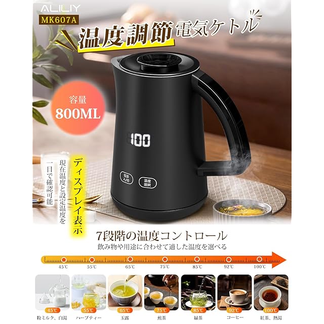 【便利な7段階温度調節・デジタル表示】日常生活でのお湯の使い道は様々ですが、沸騰機能しかない電気ケトルの場合、わざわざ温度を測らなければいけないので不便です。特に使用する機会が多い飲み物類や調理の際には、求められる最適な温度がそれぞれ異なります。Aliliy電気ポットは7段階(45/55/65/75/85/92/100℃)の温度設定機能付き、コーヒー・紅茶・ミルク・カップ麺などの用途に合わせて温度設定ができます。さらに、温度が本体に直接表示され、現在温度と設定温度を一目で確認できますので便利です。