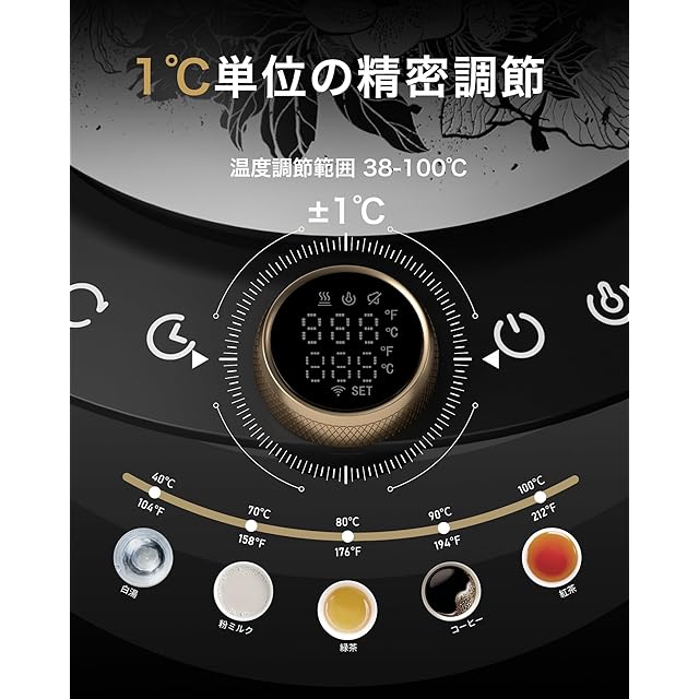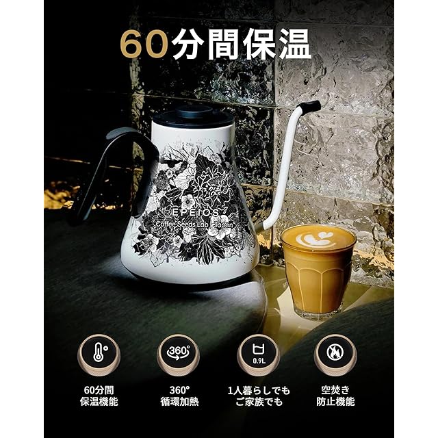 【理想的な抽出が実現できる最も重要な性能を3つを集約】①エペイオスコーヒーケトルは精度1℃単位、38~100℃(100~212°F)まで温度調節でき、コーヒーを抽出の水温を正確にコントロールし、液晶ディスプレイを搭載により、リアルタイムの温度と目標温度も表示できます。②最長5分のドリップタイマー機能を搭載により、最適な時間に最適な温度でコーヒーを抽出できます。③保温機能も備えたコーヒー用電気ケトルとして、ワンタッチで60分間作動して追加での抽出にもすぐに対応できます。