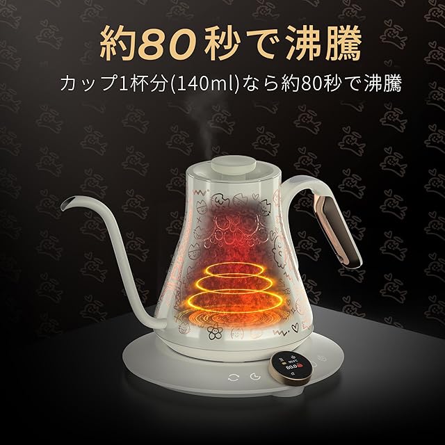 【「Kawaii」と「Cartoon」の美学をドリップケトルの形にコーヒーの世界へ】フランスのデザイナー・アーティスト「CHANNOIR」は黒猫のモチーフを用いた鮮やかなスタイルで知られています。彼の作品は日本の漫画やアニメに影響を受け、「Kawaii」と「Cartoon」の美学を現代アートに取り入れています。今回のコラボは、フランスの「スポーツの祭典」にインスパイアされ、フランスのエレガンスと日本の伝統美、さらに現代ポップアートの融合を目指した限定版ドリップケトルです。猫のイメージは、幸運を象徴する招き猫など日本の伝統的なシンボルを意識して描かれています。全国限定500個の販売となりますので、ご購入希望のお客様はお早めにどうぞ。 限定コラボの特別セット内容:電気ケトル本体*1、電源ベース*1、コーヒーマット*1。 【0.5°単位の精度調整のアップグレード】EPEIOS限定版のエペイオスドリップケトルは、既存品で実現していた1°単位の温度調整からさらに進化し、38℃から100℃までより細かく調整可能な0.5°単位の精密な温度調節を実現しました。これにより、コーヒー抽出における理想的な温度設定が可能になるだけでなく、より繊細な温度管理が求められるお茶やミルクの準備にも対応できます。また、最長10分間のドリップタイマー機能と1時間の保温機能を備え、プロ並みのドリップ体験もより気軽に可能と。さらに、改良された注ぎ口の形状により、湯量や注ぎ速度のコントロールが一段と容易になり、初心者からプロフェッショナルまで、どなたでも快適にご使用いただける設計となっています。 【約80秒で沸騰】1040Wの高出力により、短時間でお湯を沸かすことができ、カップ1杯分(140ml)なら約80秒で急速に加熱します。食品級のステンレス製で耐久性が高く、安全性にも配慮。錆に強く、有害物質が溶け出す心配がなく、耐熱・保温性に優れています。また、メモリー機能と空焚き防止機能も搭載され、安心して使用いただけます。いつでも簡単にお好みの温度設定にて、素早く美味しいコーヒーを淹れることができます。 【使いやすさにこだわったハンドルデザイン】Epeiosドリップケトルは、手首や腕への負担を軽減するよう設計された、「人間工学」に基づくハンドルを採用しています。持ち手が熱くならないので安心して使え、自然と適切な注ぎ角度を保てるデザインになっています。初心者でも簡単に扱え、どなたでも美味しいコーヒーを淹れられるように工夫しております。また、90°の注ぎ角度でお湯の量や流れの速さを自由に調整でき、注ぎ口の形状も改良されており、正確でスムーズな注ぎが可能です。さらに、取り外し可能なカスタマイズハンドルは、安全性と断熱性に優れており、個性をプラスしたデザインでコーヒータイムをより楽しく演出します。優れた機能性のみならず、スタイルよくコーヒードリップ体験を最大限に楽しめられし、本格的な抽出体験をお楽しみいただけます。 【一人でも、家族でも、特別なシーンに合わせて楽しめるドリップコーヒー】Epeios電気ケトルは0.9Lの容量で、一人分のコーヒーから家族全員分まで幅広く対応可能です。普段使いの電気ポットとしても便利で、忙しい朝の一杯からリラックスタイムまで、さまざまなシーンで活躍します。また、誕生日プレゼント、引越し祝い、結婚記念日、クリスマス、母の日、父の日など、大切なイベントでの贈り物としてもぴったりです。コーヒーの香りと味を丁寧に引き出すことができ、特別な日のおもてなしや、ご家庭でのお茶会など、幅広い場面でお使いいただけます。一人でゆっくり過ごす時間も、大切な人と共有する時間も、Epeios電気ケトルが特別なひとときを演出します。 【限定コラボならではの特別なセット内容】今回のコラボデザインだからこそ手に入る特別なセットをご用意しました。セットには、洗練されたデザインの電気ケトル本体と、使用しやすい電源ベース(電源コード長:約1m)に加え、実用性と美しさを兼ね備えたコーヒーマットも同梱しております。 【安心な日本サポート】すべての製品は出荷前に厳しい検品を行い、万が一、初期不良や故障が発生した場合には、迅速に対応いたします。お問い合わせは以下までお気軽にどうぞ: メールアドレス:[email protected] 「注文番号を添えてご連絡ください」 「注文履歴」>「注文に関する問題」>「プロフィールを表示」>「質問する」