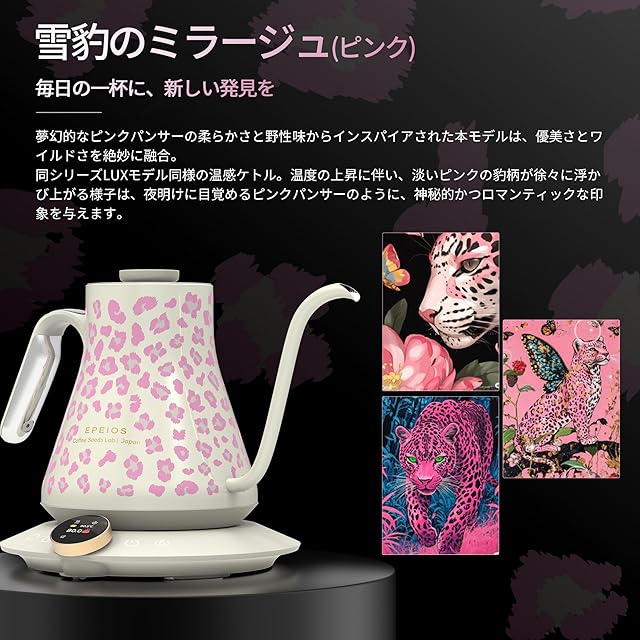 【温度がつくり出す、美しい色の変化】EPEIOS温感電気ケトル「ピンクレオパード」は、温度で色が変わる特殊プリント技術を使ったLUXシリーズの新モデル。ふんわりとした可愛らしさと、秘めた力強さをあわせ持つピンクパンサーをイメージし、やさしさとワイルドさが調和したデザインに仕上げました。加熱が進むと、ポット表面に淡いピンクのヒョウ柄がふわっと浮かび上がり、まるで夜明けに目を覚ますピンクパンサーのような表情を見せてくれます。ロマンティックでやわらかな雰囲気を演出しながら、毎日のコーヒータイムやティータイムに華やかさと癒しをプラスしてくれます。