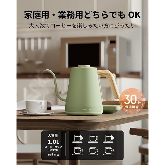 商品名:《新品未開封》電気ケトル コーヒー HAGOOGI (ハゴオギ) ドリップケトル 1.0L 1200W コーヒーポット 温度調節 (1℃単位)/保温機能/空焚き防止/通知音オン・オフ/PSE認証済み 細口 紅茶 お茶 クリスマス 新年 プレゼント用 ドリップ ポット 木目調 キッチン用品 (グリーン)