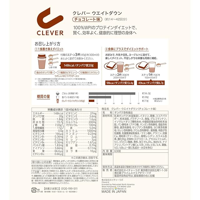 100%WPI(ホエイプロテインアイソレート)のプロテインダイエットで、賢く、効率よく、健康的に理想の身体へ。 1食置き換えや、食事にプラスしてお召し上がりください。 チョコレート味[約14~42回分]。 ●11種類のビタミン(*1)/10種類のミネラル(*2)/乳酸菌/MCTオイル 配合 (*1) 11種類のビタミン:V.A、V.B1、V.B2、V.B6、V.B12、V.C、V.D、V.E、ナイアシン、パントテン酸、葉酸 (*2) 10種類のミネラル:カルシウム、マグネシウム、鉄、カリウム、銅、亜鉛、マンガン、セレン、クロム、モリブデン ※パッケージデザイン等は予告なく変更されることがあります