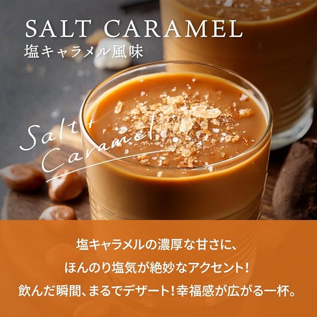 「CONCEPT 《ありのままの自分を好きになる》 コンプレックスに思っていた部分も 宅トレで自信に変わり 自信が笑顔に変わり人生が変わる。 どんな自分もありのまま好きになる。 昨日より“今日”ハッピーになれるように! そんなあなたと“一緒に”歩んでいきます!」 【栄養成分表示】 ・チョコレート風味 1食当たり エネルギー 73.6kcal、たんぱく質 15.2g、脂質 1.3g、炭水化物 2.3g、食塩相当量 0.3g ・塩キャラメル風味 1食当たり エネルギー 75kcal、たんぱく質 15.0g、脂質 1.3g、炭水化物 3.2g、食塩相当量 0.3g ・抹茶風味 1食当たり エネルギー 75.8kcal、たんぱく質 15.0g、脂質 1.1g、炭水化物 3.2g、食塩相当量 0.3g ・カフェラテ風味 1食当たり エネルギー 75.2kcal、たんぱく質 15.5g、脂質 1.4g、炭水化物 2.5g、食塩相当量 0.4g