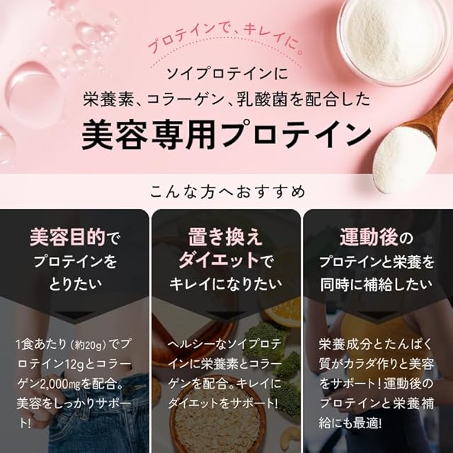 ✅【オールインワン美容プロテイン】1食(20g)当たりたんぱく質12g、ビタミン11種、ミネラル11種、乳酸菌100億個、コラーゲン2000㎎を配合した女性向けの美容プロテインです。これ1つで栄養補給しながら美容をサポートします。