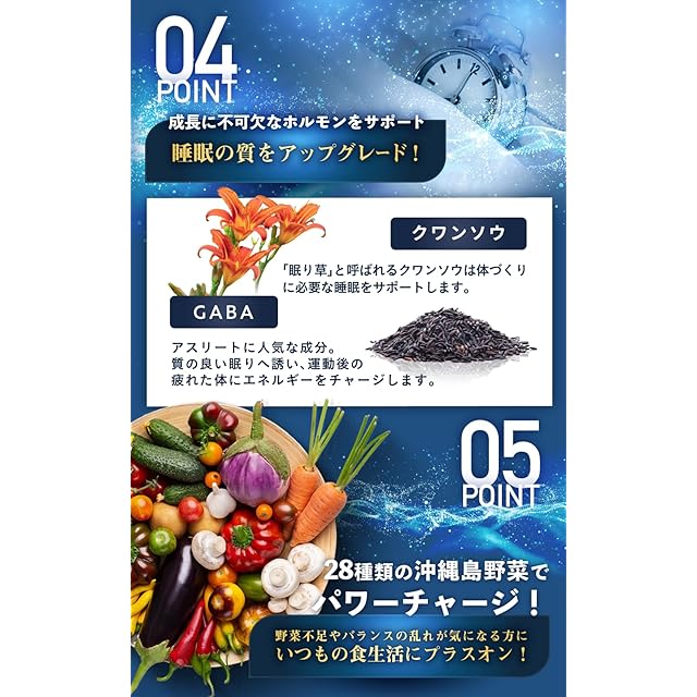 栄養機能食品【 カルシウム ・ 鉄分 ・ ビタミンB1 ・ ビタミンB2 ・ ビタミンB6 ・ ビタミンC ・ ビタミンD 】 国産 モリンガ、16種類の沖縄島野菜、大豆 プロテイン 、 HMB 、 クレアチン 、9種の 必須アミノ酸 、 α-GPC 、88種類の果実や野菜を使用した植物性 乳酸菌 発酵エキス、 GABA 、 DHA 、 アルギニン 、 オルニチン 、 シトルリン 、 ビタミンK 、 マグネシウム などバランスにこだわり厳選。 スポーツ も 勉強 も一生懸命な中高生に嬉しい栄養素を1杯にギュギュっと配合しました!
