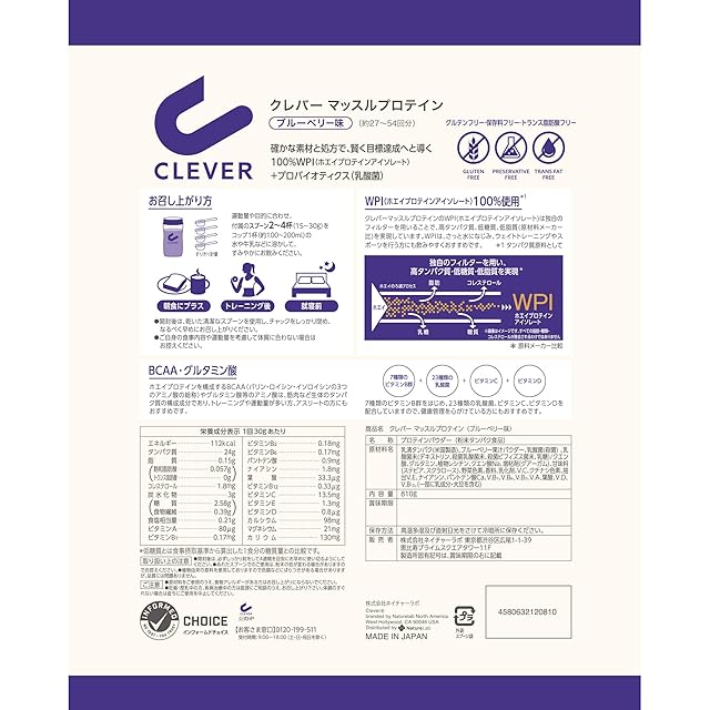WPI(ホエイプロテインアイソレート)100%(*1)+プロバイオティクス(乳酸菌)。<br>溶けやすくておいしいプロテインパウダー。ブルーベリー味[約27~54回分]。<br> ●クレバー マッスルプロテインのWPIは独自のフィルターを用いることで、高タンパク質、低糖質(*2)、低脂質を実現。(原料メーカー比較)<br> ●WPIは、さっと水になじみ、ウエイトトレーニングやスポーツを行う方にも飲みやすくおすすめのプロテインパウダーです。<br> ●7種類のビタミンB群/21種類の乳酸菌/ビタミンC/ビタミンD 配合<br> ●グルテンフリー・保存料フリー・合成着色料フリー<br> *1 タンパク質原料として *2 低糖質とは食事摂取基準から算出した1食分の糖質量との比較です。<br> ※パッケージデザイン等は予告なく変更されることがあります"