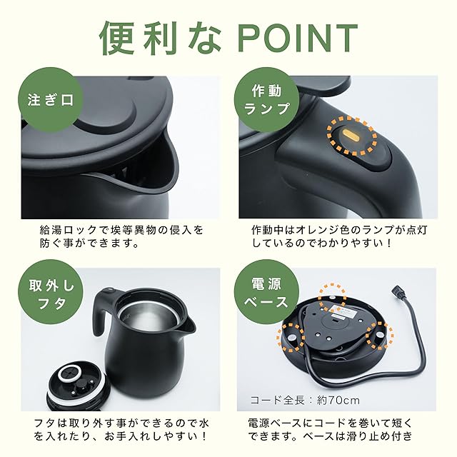 漏水防止の安心設計! スイッチ一つで簡単にお湯が沸かせます。 転倒湯漏れ防止、給湯ロック機能、空焚き防止、自動電源オフの安心設計で おじいちゃん、おばあちゃんへのプレゼントにもオススメ! 内部がステンレスの二重構造仕様なのでお手入れしやすく、 沸かしたお湯が冷めにくいのもポイント! フタは取り外し式で給水しやすく洗いやすい!