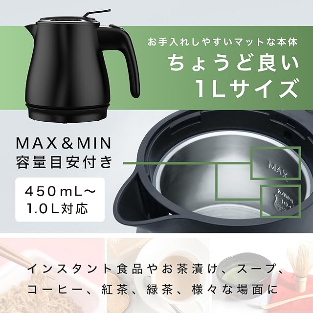 【内部ステンレス&2カラー】内部がステンレスの2重構造。ステンレスケトルのメリットを生かしつつ、外側はプラッチックなのでホワイト、ブラックのカラーが選べます。内部がステンレスなのでお手入れもしやすいのも嬉しい!