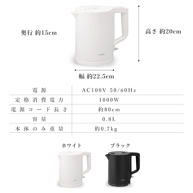 商品名:《新品未開封》ドリテック(dretec) ピタポット 転倒時湯漏れ防止構造 電気ケトル 0.8L 電気 ケトル 自動オフ 空焚き防止 お手入れ簡単 転倒防止 安全設計 ブラック