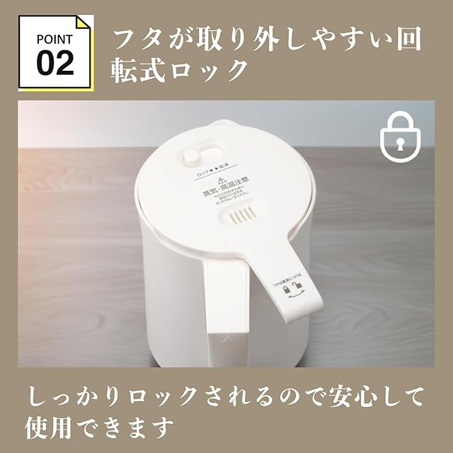 フタが取りはずしやすい回転式ロック、しっかりロックされるので安心して使用できます