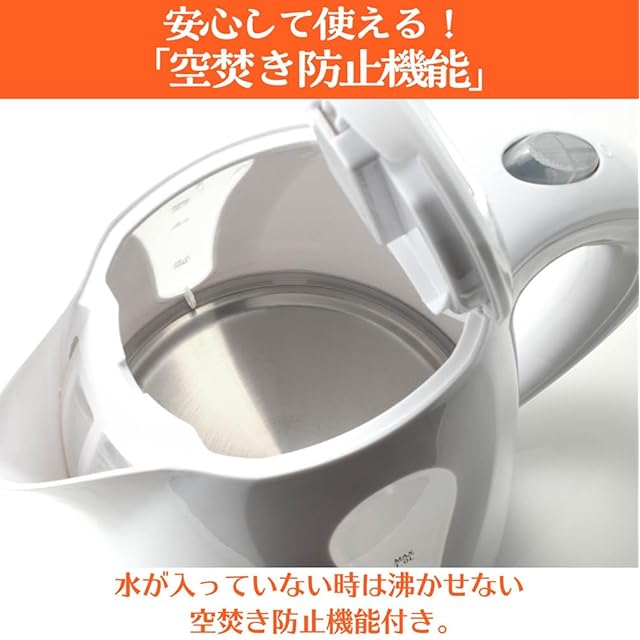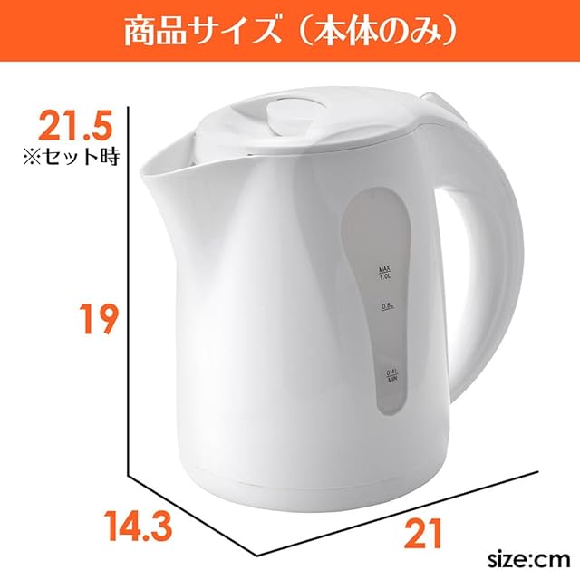 累計販売数100,000台を突破しおかげさまで完売した<br> 「ワンプッシュ電気ケトル1.2L」の後継機が新登場!<br> 使いやすさはそのままに、よりシンプルなデザインが<br> 心地良さを演出する「電気ケトル1.0L」です。 <br><br> ◎ちょうどいい容量1.0L!<br> ◎わずか3分でお湯を沸かせます!(0.4L時)<br> ◎大きめで使いやすい「オープンボタン」<br> ◎お湯が沸くと「自動で電源OFF」<br> ◎「大きな水位窓」でお湯の残量が一目瞭然!<br> ◎安心の「空焚き防止機能」付き!<br> ◎場所を取らない「コード巻き込み電源ベース」<br> ◎インテリアに合わせて選べる「4色カラーバリエーション」<br> ◎どこにでも馴染みやすい「シンプルデザイン」 <br><br> ◎商品仕様 <br> ●サイズ(約):<br> [本体] H19 x W21 x D14.3 cm <br> [電源プレート] H3.5 x W14.3 x D14.3 cm <br> ●重量(約):620g(セット時)<br> ●容量(約):1.0L <br> ●コード長(約):70cm <br> ●取扱説明書兼書:有<br> ●パッケージサイズ(約): W20 × H19.5 × D15 cm <br><br> ※本商品はワンプッシュ電気ケトル1.2Lの後継機です。<br> レビューや評価等はその商品に対するものであることを<br> 予めご了承の上、ご検討くだされば幸いです <br><br> ※使用上の注意<br> ●本機には転倒時の漏水防止機能は有りません。<br> 転倒すると熱湯が漏れ出し火傷の恐れがございます。<br> 子供の手の届かない、又コードが足等に<br> 引っ掛からない場所に設置してください。<br> ●ケトル本体に水が入っていないときは<br> スイッチをONにしないでください。<br> 故障の原因になります。<br> ●水以外のものを沸かさないでください。<br> 故障や汚れの原因になります。<br> ●本製品は保温機能がありませんので、<br> 必要な時に必要な量だけ沸かしてください。<br> ●長時間お使いにならないときは、お手入れ後、<br> 十分に自然乾燥あせてから保管してください。<br> ●必ずケトルの内側のMAX目盛りで<br> お湯を沸かしてください。<br> ●ケトルと給電スタンドの接触端子部を<br> 確実に接触させてください。