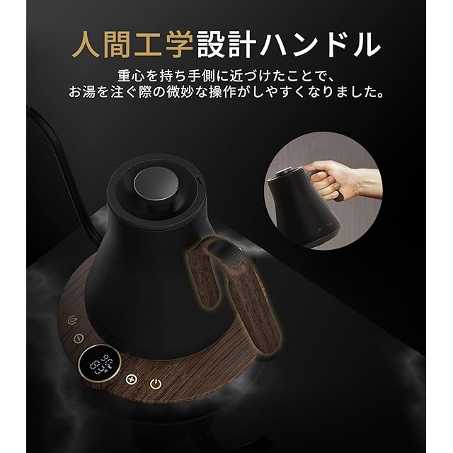 【人間工学設計ハンドル】人間工学に基づいたハンドル設計を採用しています。お湯を注ぐ際、手首や腕にかかる負荷を軽減し、繊細な操作を行うことができます。熱くならず、持ちやすいハンドルで、持つだけで自然と注ぐ角度になるように設計したことで、初心者でも操作しやすくケトルになりました。