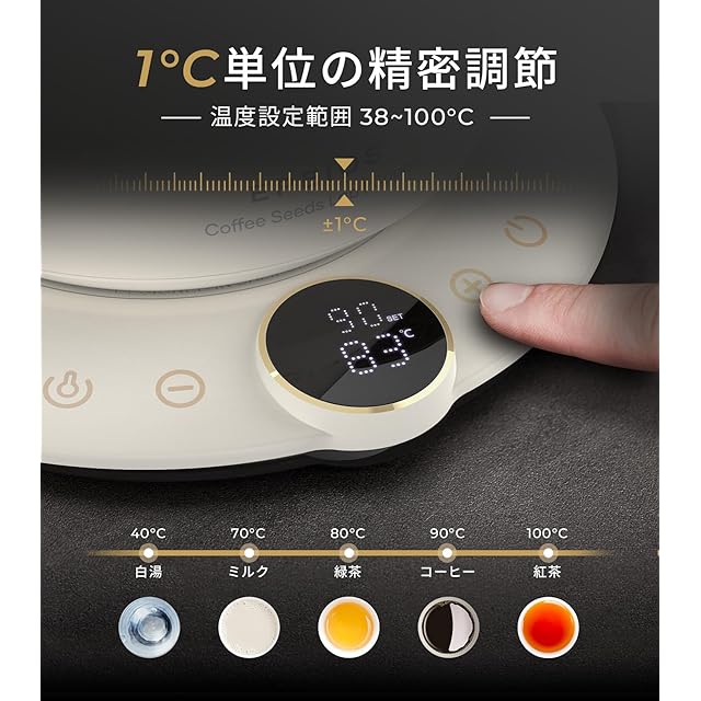 【1°C単位の精密調節】エペイオスのコーヒーケトルは、細部に宿る美味しさを追求、1℃の調整で究極の一杯を実現します。このケトルは1°C単位の精密調節で、38~100℃までの範囲で設定できます。細かく挽いたコーヒー豆と、時間や温度を精密に調整したお湯を組み合わせて抽出することで、最高品質のコーヒーを提供します。