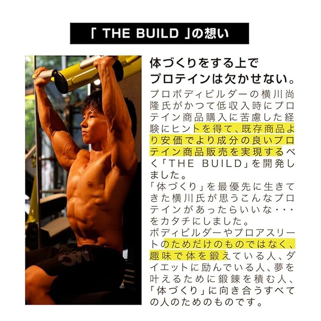 【日本一のボディービルダー 横川尚隆】 「体づくり」を最優先に生きてきた僕が思う「こんなプロテインがあったらいいな…」をカタチにしました。 僕のようなボディビルダーやプロアスリートのためだけのものではありません。 趣味で体を鍛えている人、ダイエットに励んでいる人、夢を叶えるために鍛錬を積む人、「体づくり」に向き合うすべての人のためのものです。 目指したのは「飲まないといけない」ではなく「飲みたい」プロテイン。 トレーニング後に欲しくなる甘いフレーバーと、手の届きやすい価格にこだわり抜きました。 『THE BUILD』、まるで乾杯するかのように、自分にご褒美をあげるかのように飲んでいただければと思います。
