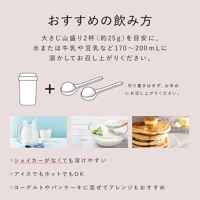 【お召し上がり方(1回分)】 大さじ山盛2杯程度(約25g)を目安に、170~200mL程度の 水または牛乳や豆乳などに溶かしてお召し上がりください。 ※シェイカー(別売)に水を入れた後、本品を入れてシェイクすると、さらによく溶けます。 ※作り置きはせず、お早めにお召し上がりください。 栄養成分表示 1回(25g)当たり エネルギー 95kcal、たんぱく質 11.9g、脂質 1.1g、炭水化物 10.4g(糖質 8.4g、食物繊維 2.0g)、食塩相当量 0.32g ビタミンA 257~684μg、ビタミンC 38mg、ビタミンE 2.1~5.7mg 【製造時配合】白玉乳酸菌 20億個、フェカリス菌 100億個
