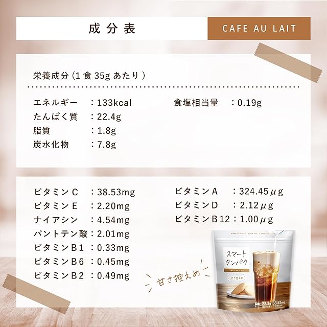 毎日の健康と美容の基盤であるタンパク質。不足しがちなタンパク質を毎日取ってほしいから、美味しさと飲みやすさをトコトン追求しました。ユーザーの声を大切にし、改善した新しいプロテインです。美味しさを追究しつつ甘さを控えめに!タンパク質も1食約22g以上、ビタミンも8種類配合。日々の食事にプラスしたり、朝食、間食、ストレッチ・運動前後、お休み前などでお召し上がりください 1食分約(約35gあたり) エネルギー 133kcal たんぱく質 22.4g 脂質 1.8g 炭水化物 7.8g 食塩相当量 0.19g