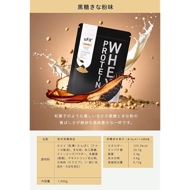 商品名:《新品未開封》【日本国内製造】uFit Whey Protein ホエイプロテイン WPC 人工甘味料不使用 黒糖きな粉 1kg 甘さ控えめ 溶けやすい 植物由来甘味料 ステビア アンチドーピング認証 プロアスリート 水谷隼 愛用 乳酸菌