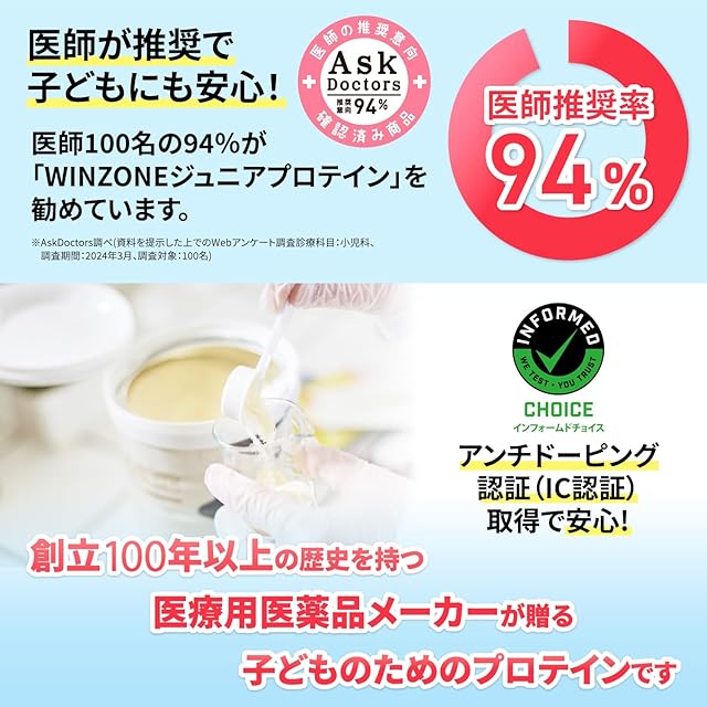 ✅【医師推奨で子どもにも安心】医師100名の94%がWINZONEジュニアプロテインを勧めています。(Ask Doctors調べ) ✅【成長をサポート】WINZONEジュニアプロテインはたんぱく質に加え、成長に必要な11種のビタミンと3種のミネラル(カルシウム、鉄、マグネシウム)を配合しています。