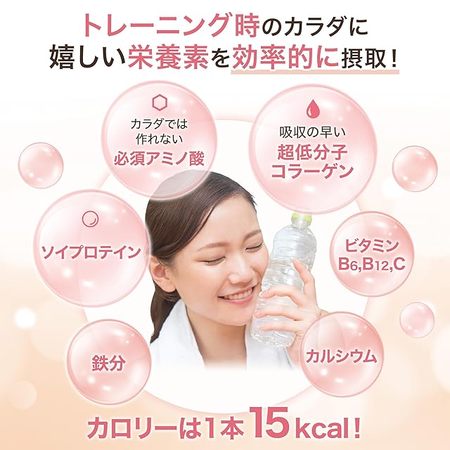 一般的なコラーゲンより吸収の早い超低分子コラーゲンを独自配合しており、鉄分・カルシウム、運動に大切なビタミンB6、ビタミンB12、ビタミンCなど、女性に嬉しい栄養素が手軽に摂取できる、
