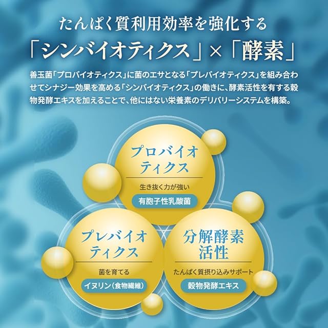 ✅【たんぱく質利用効率サポート③】水溶性食物繊維であるプレバイオティクスのイヌリンが、プロバイオティクスの働きをバックアップ。体内でのプロバイオティクスのパフォーマンスを向上させる。