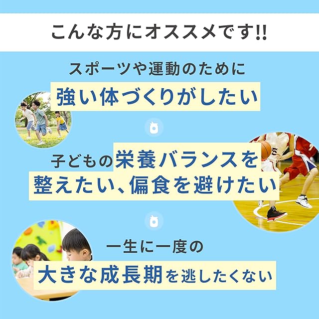 成長に欠かせない栄養素を独自のバランスで!1杯目目安(約15g当たり)の各栄養素の食品換算。 カルシウム:285mg/食(マイワシ約12尾分) ビタミンD:1.65μg/食(しいたけ約34.4個分) ビタミンB6:0.5mg/食(鶏卵約10.8個分) 亜鉛:3.2mg/食(トマト約26個分)