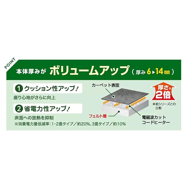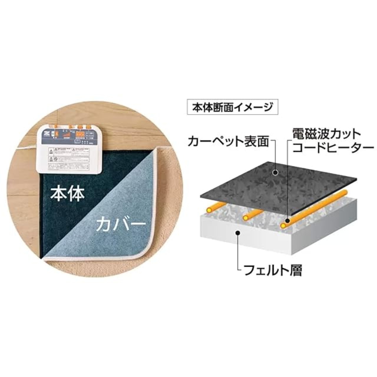 リビングやダイニングを足元から優しく暖める高性能なホットカーペット。 電磁波を99%カットする独自のW-Line-Cross方式 コードヒーターの中に電流の向きが異なる2本の熱線を交互に巻きつけることにより、 電気が流れることで発生する電磁波(磁界)同士が打ち消し合い(相殺)、電磁波(磁界)の発生を抑えました。 「電力1/3運転」「ひかえめモード(自動電力調整運転機能)」「7面切替運転」など省エネに役立つ機能を搭載。 また、便利なダニ対策機能、切り忘れ防止タイマーなど安心・簡単にお使いいただける機能も付いています。