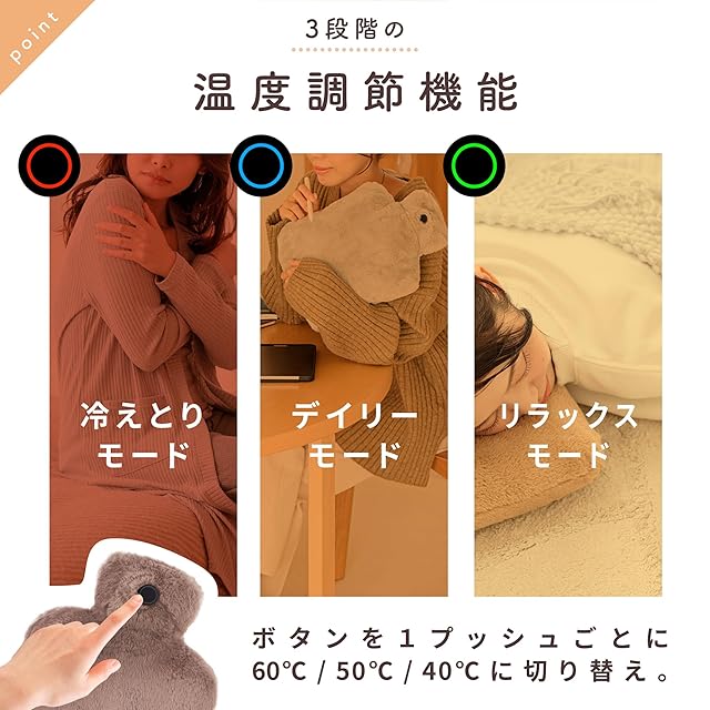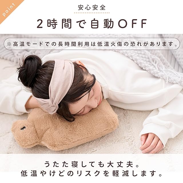 温度3段階:弱 約40℃/中 約50℃/強 約60℃(±3℃)自動オフ:連続約120分で安全停止。