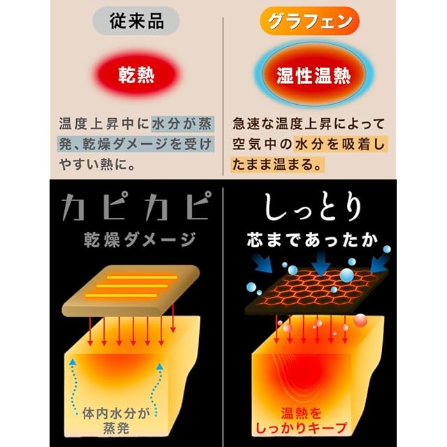 【ノーベル賞研究対象原料 グラフェン発熱のひみつ】 グラフェンは、原子1層の厚さしかない炭素素材で、優れた導電性と熱伝導性を持っています。通電すると素早く均一に熱を生み出し、遠赤外線を放射して、乾燥感のない心地よい温もりを実現します。