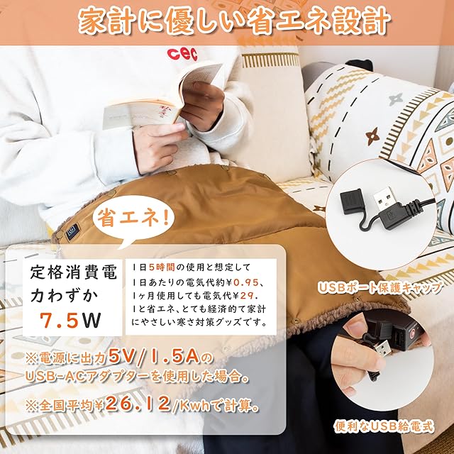 【USB給電式ホットマット&省エネ】:便利なUSB給電式、モバイルバッテリー、PC等のUSBポートから簡単に給電。19cmのUSB延長コードも付き、電源が離れた場所にあっても気軽に使えます。電源に出力5V/1.5AのUSB-ACアダプターを使用した場合,定格消費電力わずか7.5W。電気代を節約できる省エネタイプのUSB電気ホットマット、とても経済的て家計にやさしい寒さ対策グッズです。※こちらの商品にはモバイルバッテリーやAC変換アダプターは付属されておりません。必要に応じて別途でご購入ください。