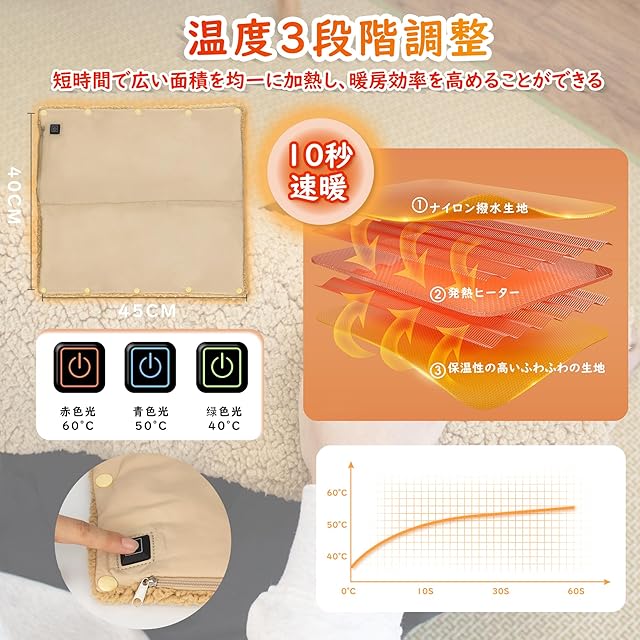 【温度3段階調整&10秒速暖】:耐久性高の加热器と绵の绒毛保温性の材料を采用、短時間で広範囲を均一に加温、より効率的に暖かくなります。また、ホットマットの温度は好みに応じて高(約60℃)中(約50℃)低(約40℃)、3段階設定可能で、赤・青・緑とボタンの色により温度段階が一目瞭然。