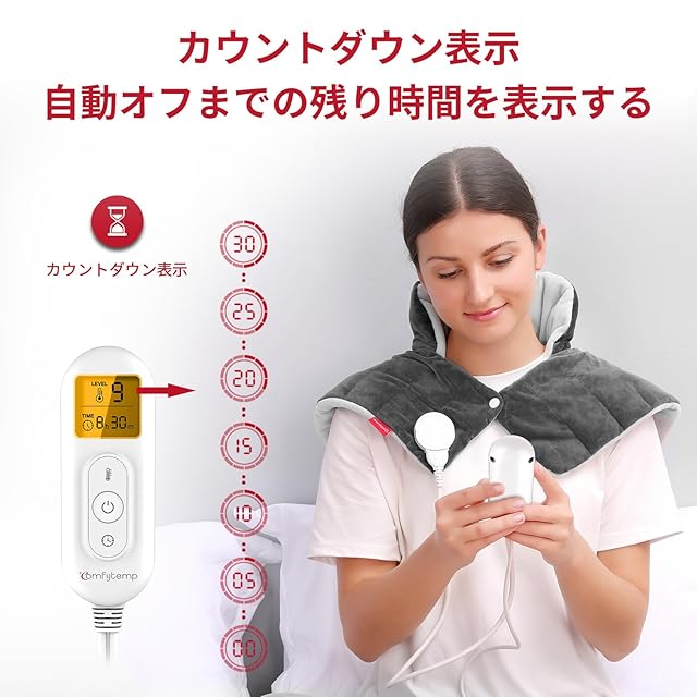 【オン状態を維持する&カウントダウン表示】:Comfytempの電気肩パッドは、オン状態を維持する機能により、連続的に熱を提供し、肩の加熱ニーズに応えます。カウントダウン表示は、ヒートセラピーの時間をコントロールするのに役立つ自動スイッチオフ時間を思い出させるでしょう。 また、背面照明で夜間でも見やすい設計です。 (注:オン状態を維持する機能では、オートオフエリアは8h88mを表示します。)当社の大きな電気毛布 敷きは、高い襟を備えており、首と肩 あたためを簡単に覆うことができます。使いやすいボタンデザインとLED表示コントローラーを備えており、高齢者でも簡単に使うことができます。