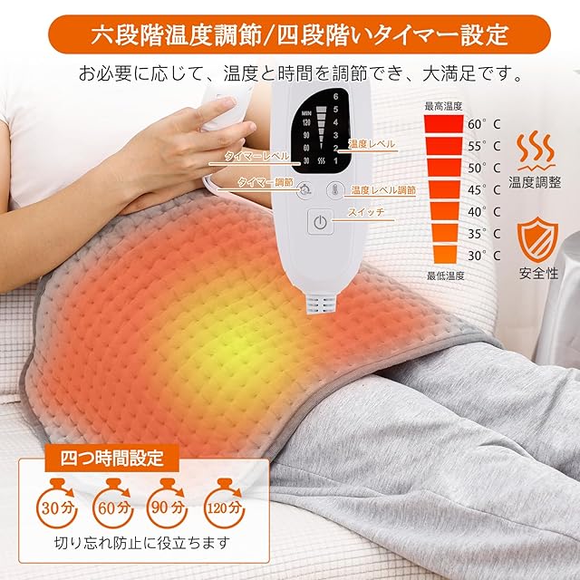【4段階タイマ一調節】電気マットの電源OFFのタイミングは、お好みにより、30分、60分、90分と120分のタイマ一に設定可能です。電力を節約する効果があるだけでなく、電源を切り忘れた時に予定時間が過ぎたら、自動で電源が切れるので、使用の安全性もアップします。