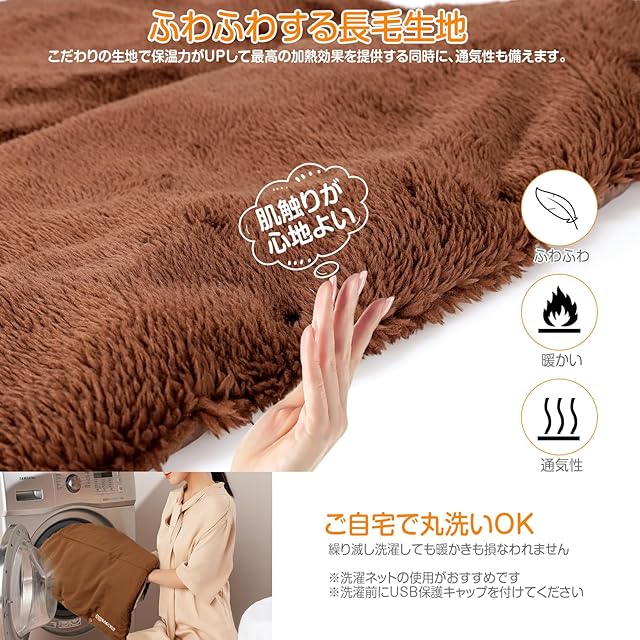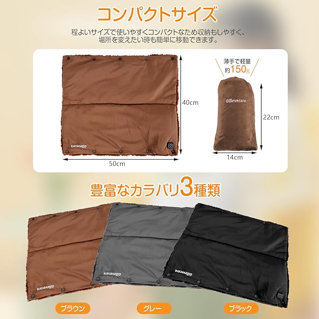 ふわふわ生地・お手入れ簡単:サイズ:約 45 × 40cm ;ミニホットカーペットの裏面は長いフランネル生地を厳選しており、保温性バッチリ、更にふかふかな肌触りを持ちます。表面はIPX4防水・撥水加工が施された生地で作られています。汚れても洗濯機や手洗いで丸洗いできますのでお手入れラクラク、繰り返し使えるから経済的!電気ホットマットには収納バッグ付きで軽量収納しやすいので、自宅だけでなくアウトドアでも活躍します。ブラック・ブラウンやグレーといったカラー展開も豊富なので老若男女問わずオススメしたいアイテムです!