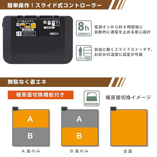【暖房面切り換え】「全体」「A面」「B面」の3つから暖房面を切り換えすることできます。一人で使用するときは「A面」、家族全員で使用する際は「全面」といったように無駄なくあたためることができるので電気代を抑えることができます。また電源を入れてから8時間後、自動で電源がOFFになる8時間OFFタイマーもありますので、切り忘れはもちろん、電気代も抑えることができます。