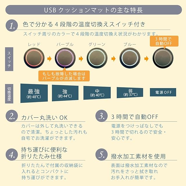 【簡単操作】黒いスイッチボタンを押すと「オン・最強⇒強⇒中⇒弱⇒オフ」と細かく4段階の温度切換やオン・オフすることができます。 また、電源を入れたまま3時間が経つと自動で電源がオフになる「3h自動OFFタイマー」付きで、切り忘れても安心です。