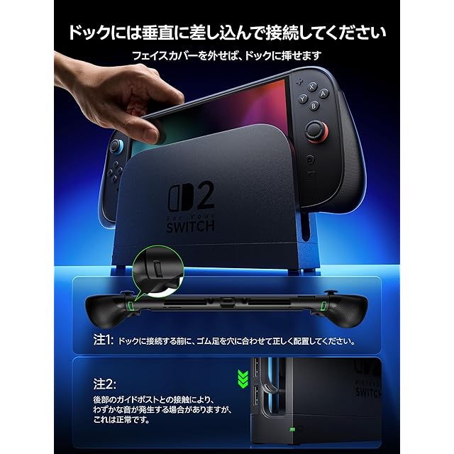 【注意】1. JoyCon保護ケースの取り付けや取り外しの際は、必ず弊社の説明動画をご覧ください。 2. Switch 2にミドルフレームを取り付けた後、両下角を押してしっかりフィットしていることを確認してください。 3. ケースを装着したSwitch 2を縦向きにドックに差し込んでください。きつく感じる場合は軽く押し込んでください。摩擦音は正常です。