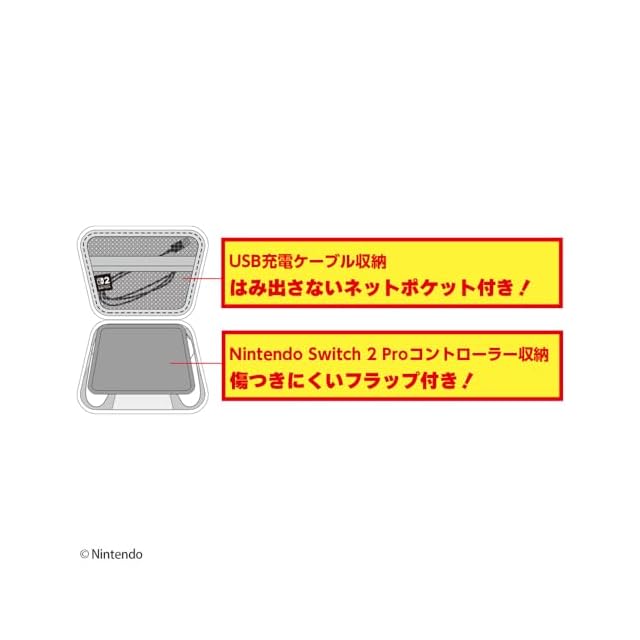 持ち運びに便利なポーチ!外側はハードなEVAシェル仕様です。 内側にはソフト生地を使用し、Nintendo Switch 2 Proコントローラー本体を擦りキズなどから守ります。 ポーチの内側にはUSB充電ケーブルを収納できる便利なポケット付き。収納物が傷つきにくいフラップ付きです。