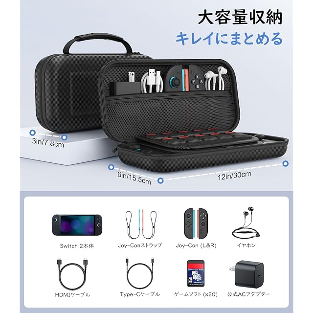 「たっぷり収納できる大容量設計」Switch 2本体の収納に加え、ゲームソフト20枚、HDMIケーブル、Joy-Conなどのアクセサリーを整理できる専用メッシュポケットも内蔵しており、豊富な収納スペースより、必要なアイテムをコンパクトにまとめることができます。持ち運びやすさを考えたレイアウトで、使い勝手の良さにもこだわっています。【Switch2公式ACアダプターは収納できます。】